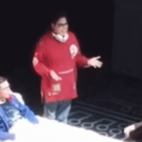 Michael Mell from Be More Chill stands in a red shirt, gesturing enthusiastically.