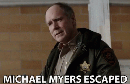 A sheriff, wearing his uniform, urgently announces that Michael Myers has escaped, signaling a dangerous situation.