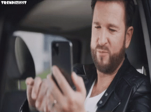 Michael Wendler makes an air kiss gesture while looking at his phone in a car.