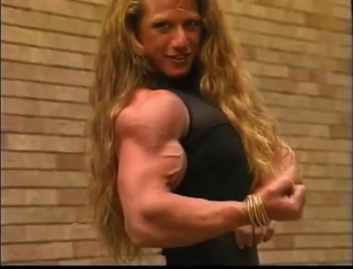 Michelle Maroldo, a female bodybuilder, flexes her impressive bicep against a brick wall.