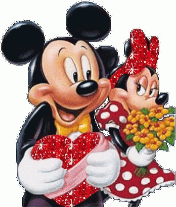 Mickey Mouse and Minnie Mouse share a loving moment, holding a red heart and a beautiful bouquet of flowers.