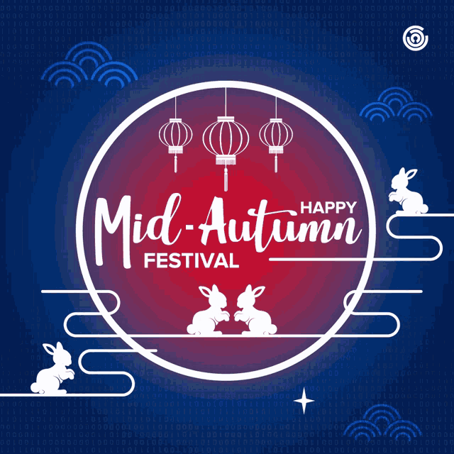 Animated greeting card for Mid-Autumn Festival featuring rabbits, lanterns, and traditional clouds.