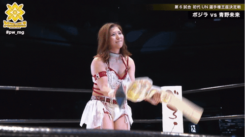 Miku Aono celebrates her victory, holding the United National Championship belt high in the Marigold ring.