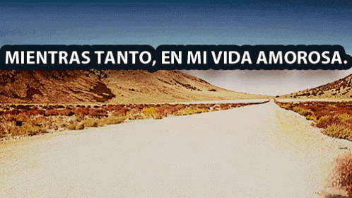 A tumbleweed rolls across a desolate desert road, humorously representing a barren love life.