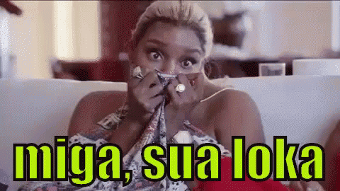 A woman reacts with wide eyes and covered mouth, embodying the 'miga, sua loka' meme.