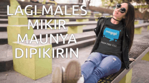 A woman relaxing on a bench, wearing a Miggi t-shirt and sunglasses, with Indonesian text "Lagi Males Mikir Maunya Dipikirin".