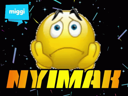 A yellow smiley face emoji with a sad expression and shrugging hands, featuring a speech bubble saying 'miggi' and 'NYIMAK' text.
