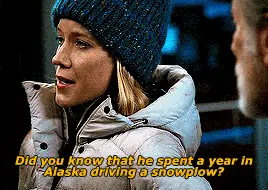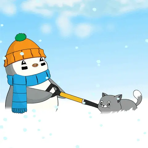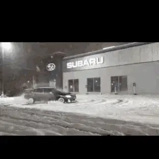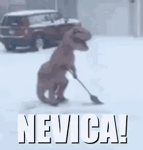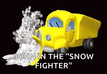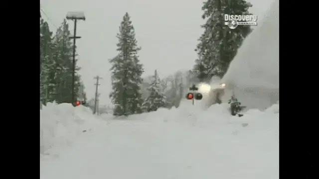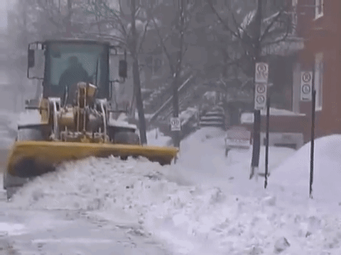 A powerful Mighty Machines snowplow clears heavy snow from a street during a winter storm.