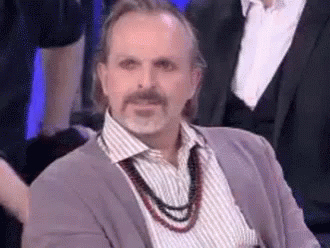 Miguel Bosé smiles broadly, wearing a striped shirt, grey cardigan, and beaded necklaces.