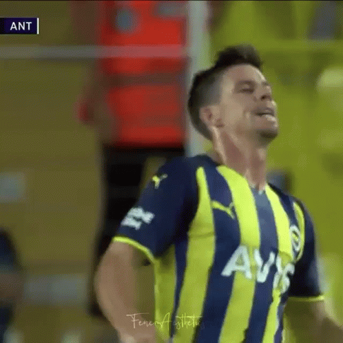 Miha Zajc celebrates a goal in his Fenerbahçe jersey, showing excitement on the field with teammates.