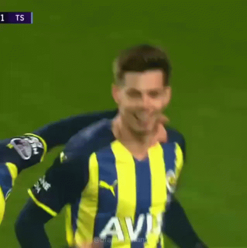 Miha Zajc, a Fenerbahçe soccer player, smiles on the field in his yellow and blue striped jersey.