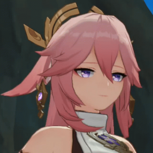Yae Miko from Genshin Impact shakes her head with a dismissive expression, showcasing her pink hair and purple eyes.