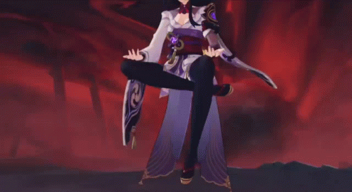 Raiden Shogun from Genshin Impact performs an elegant pose, then opens her eyes, saying "So, we meet again".