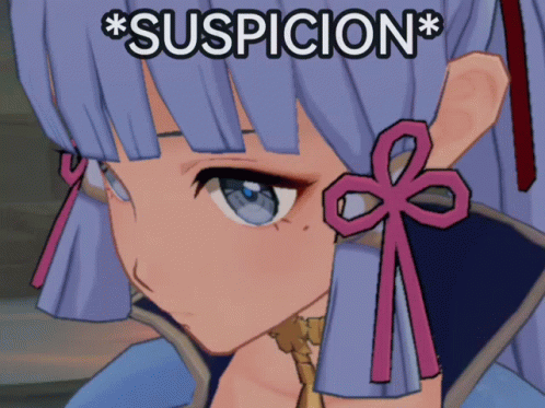 Ayaka from Genshin Impact with a suspicious expression, featuring the text '*SUSPICION*'.