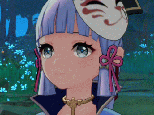 Ayaka from Genshin Impact blinks and smiles, wearing her fox mask and pink hair bows.