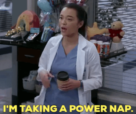 Mika Yasuda (Midori Francis) from Grey's Anatomy declares 'I'm taking a power nap' while holding coffee.