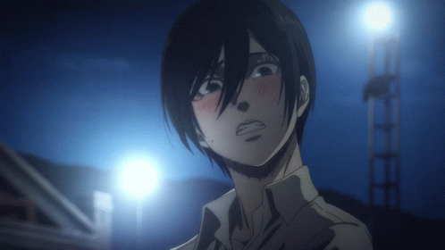 Mikasa Ackerman from Attack on Titan blushes and gulps, showing an embarrassed expression.