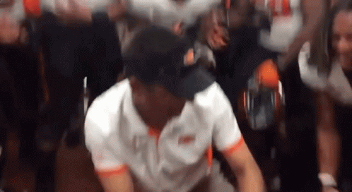 Mike Gundy shows off his dance moves in a locker room, surrounded by people in a celebratory atmosphere.