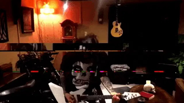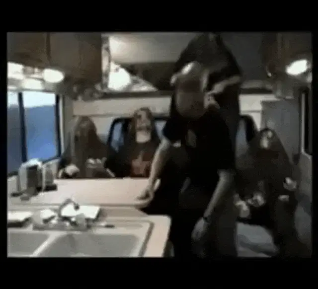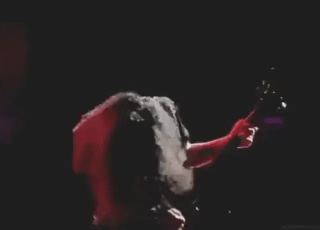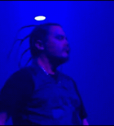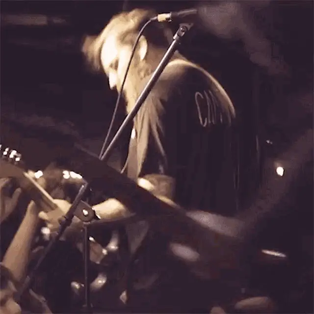 Mike Patton of Mr. Bungle headbanging energetically during a live performance under blue stage lights.
