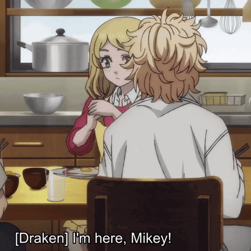 Mikey, Manjiro Sano, is eating when Draken, Ken Ryuguji, calls out, leading to a humorous exchange.