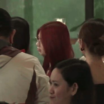 Mikha Lim of BINI with red hair, showing a surprised reaction in a crowd.