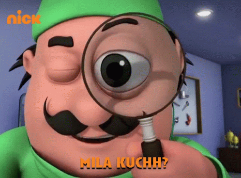 Motu, the cartoon character, intently searches with a magnifying glass, asking 'Did you find anything?'