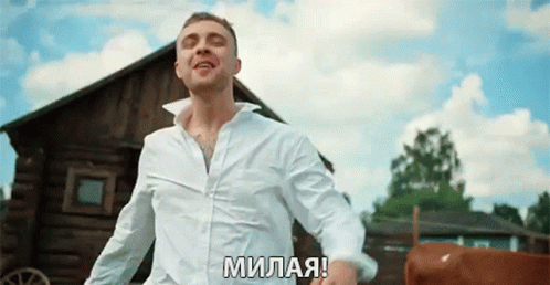 Egor Creed smiles in a white shirt, standing with a cow and a wooden house, with the caption 'SWEETY!'.
