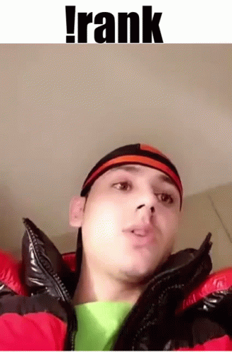 Milan Jaff reacts to a Discord !rank command, making funny faces while wearing a red jacket and headband.