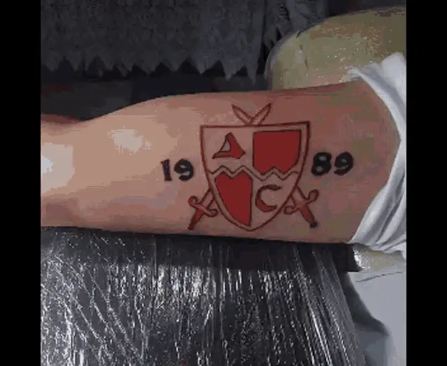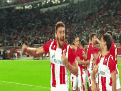 Milan Pavkov celebrates a goal for FK Crvena Zvezda with teammates in a stadium.
