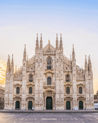 The iconic Duomo di Milano, a magnificent Gothic cathedral in Milan, Italy, under a clear sky.