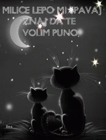 Milica, sleep well, know that I love you a lot. Two cute cats under a crescent moon and twinkling stars.