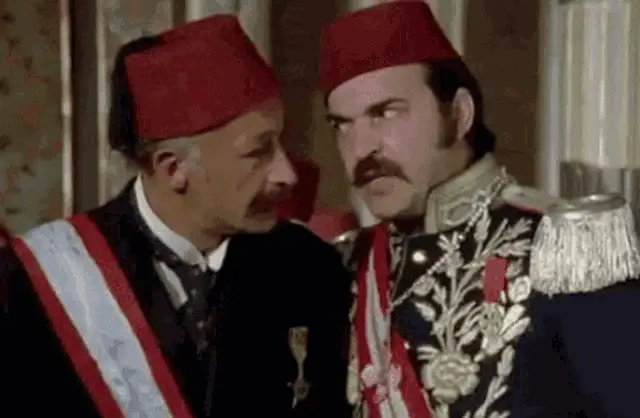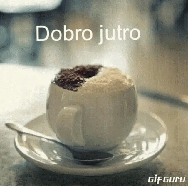 Miljenko Manjina asks 'Is there coffee?' in Složna Braća, at a table with friends and a woman in a red apron.