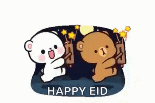 Milk and Mocha Bears joyfully celebrate Eid, holding sticks under a moonlit night sky.