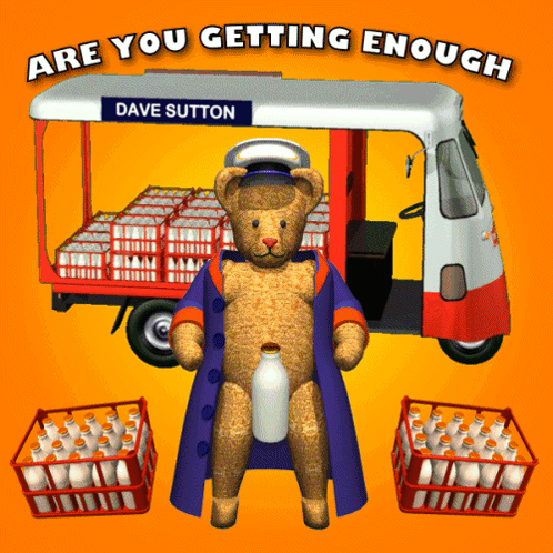 A 3D animated teddy bear milkman stands with a milk bottle, in front of a milk float by Dave Sutton.