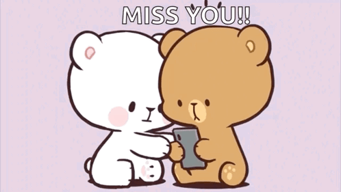 Cute Milkmochabear characters hugging, with one kissing the other's cheek, expressing 'Miss You!!'