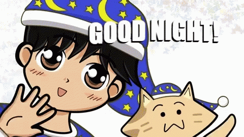 Animated boy and cat in sleep caps wave goodnight, featuring the text 'GOOD NIGHT!' from Millepedia.