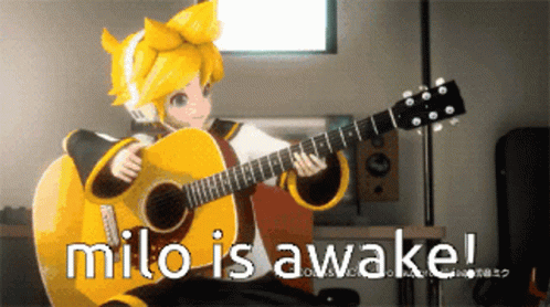 Kagamine Len plays an acoustic guitar as the text 'milo is awake!' appears on screen.