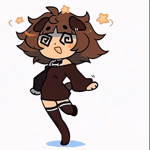 A cute cartoon girl, Мими, with dog ears and a tail, looking dizzy with swirling eyes and stars.