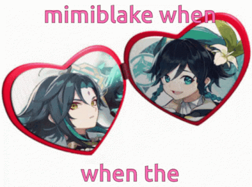 Mimiblake meme featuring Genshin Impact characters Xiao and Venti in heart-shaped frames that close.
