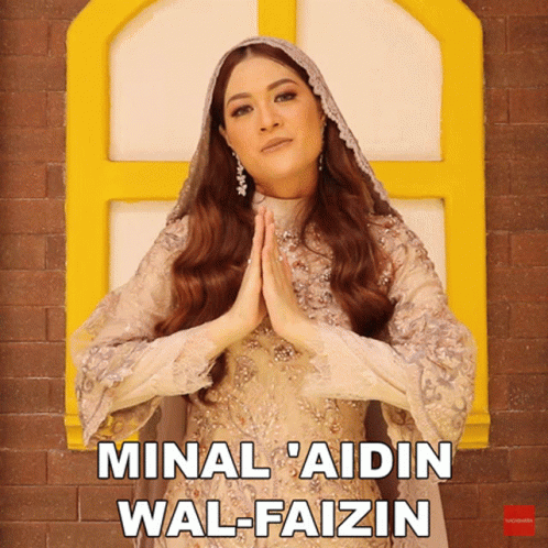 Hesty Klepek Klepek offers a Minal Aidin Walfaizin greeting, hands pressed together in traditional attire.