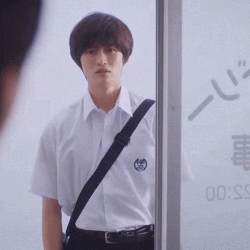 Shintaro Katsuki, from Minato Shoujo Coin Laundry, looks annoyed while standing by a glass door.