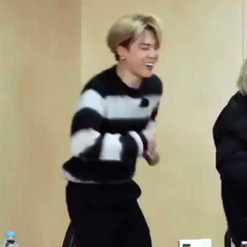 Jimin laughing and dancing energetically in a black and white striped sweater.