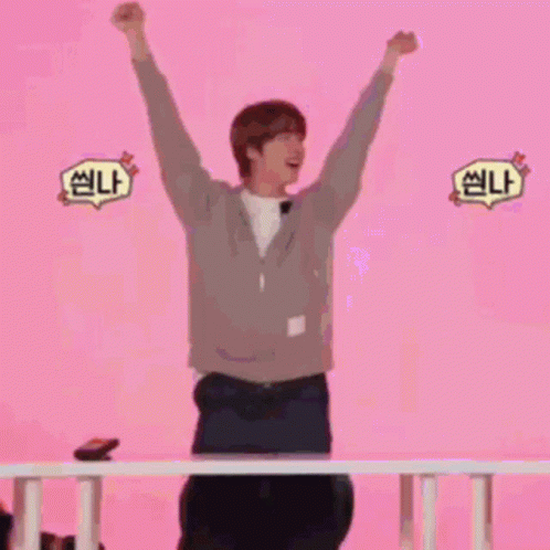 BTS's Jin (Seokjin) celebrates with arms raised, showing excitement during a Mincarti moment.