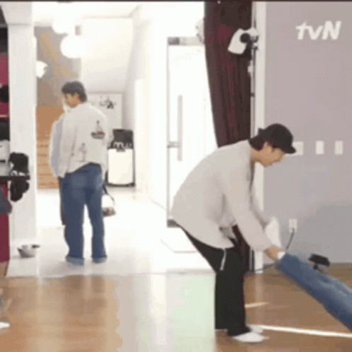Taehyung playfully drags Yoongi across the floor in a funny moment from tvN, featuring Taegi.