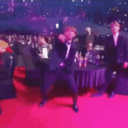 Taehyung performs an energetic Nae Nae dance in a suit on a red carpet at a formal event.