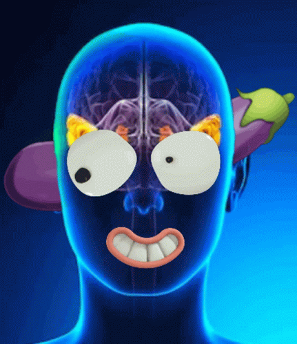 A computer-generated image of a person's head with a visible brain, cartoon googly eyes, a mouth, and eggplants for ears.