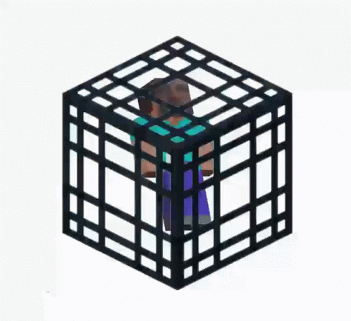 A Minecraft character is trapped inside a black grid-like cube, resembling a spawner, against a white background.