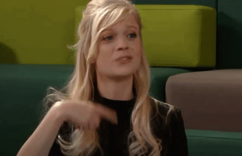 Blonde woman in a black top sitting on a green couch, explaining concepts related to Minecraft and Mojang.
