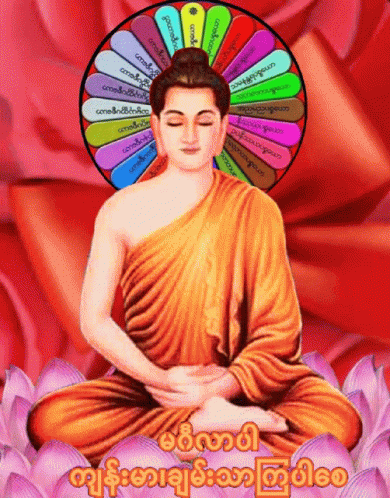 Buddha meditating on a lotus flower with a colorful halo, featuring Burmese script and a serene expression.