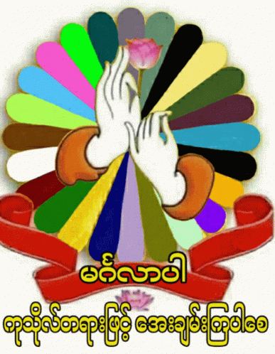 Animated logo with praying hands, a lotus flower, and colorful changing petals, featuring Burmese text 'Hello Sadhu'.